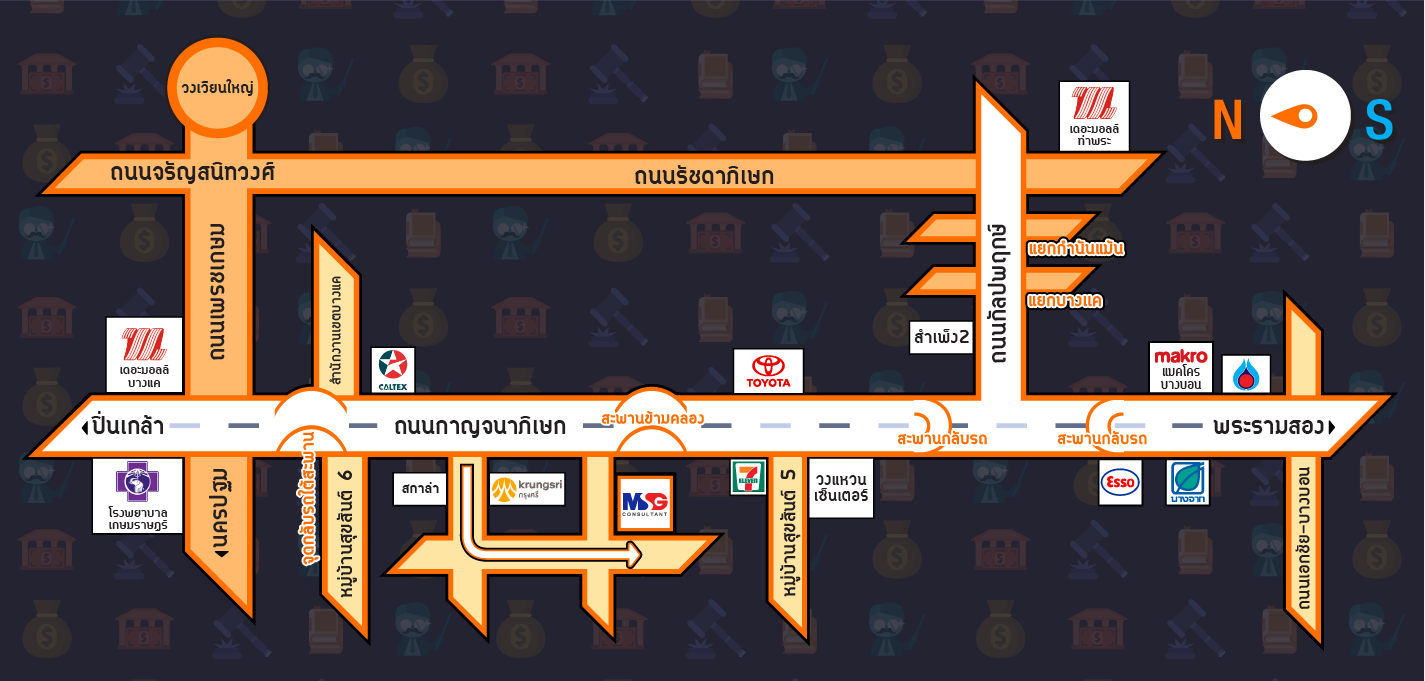 - ประมาณ 200-250 เมตร จะพบถนนเข้าซอย เมื่อข้ามสะพานข้ามคลอง (ด้านหน้าจะมีกรุงศรี ออโตฯ และบริษัท สกาล่าฯ อยู่ปากซอย)